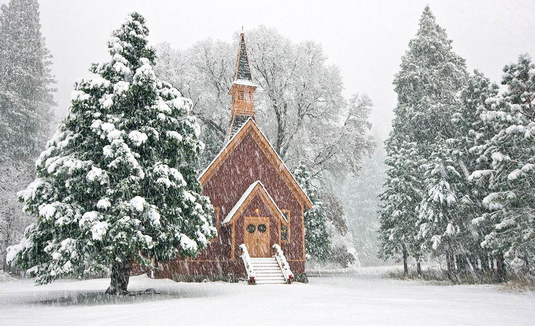 Heavy snowfall during a winter storm in Yosemite National Park, with Yosemite Valley Chapel decorated with Christmas wreaths, garlands, and red bows