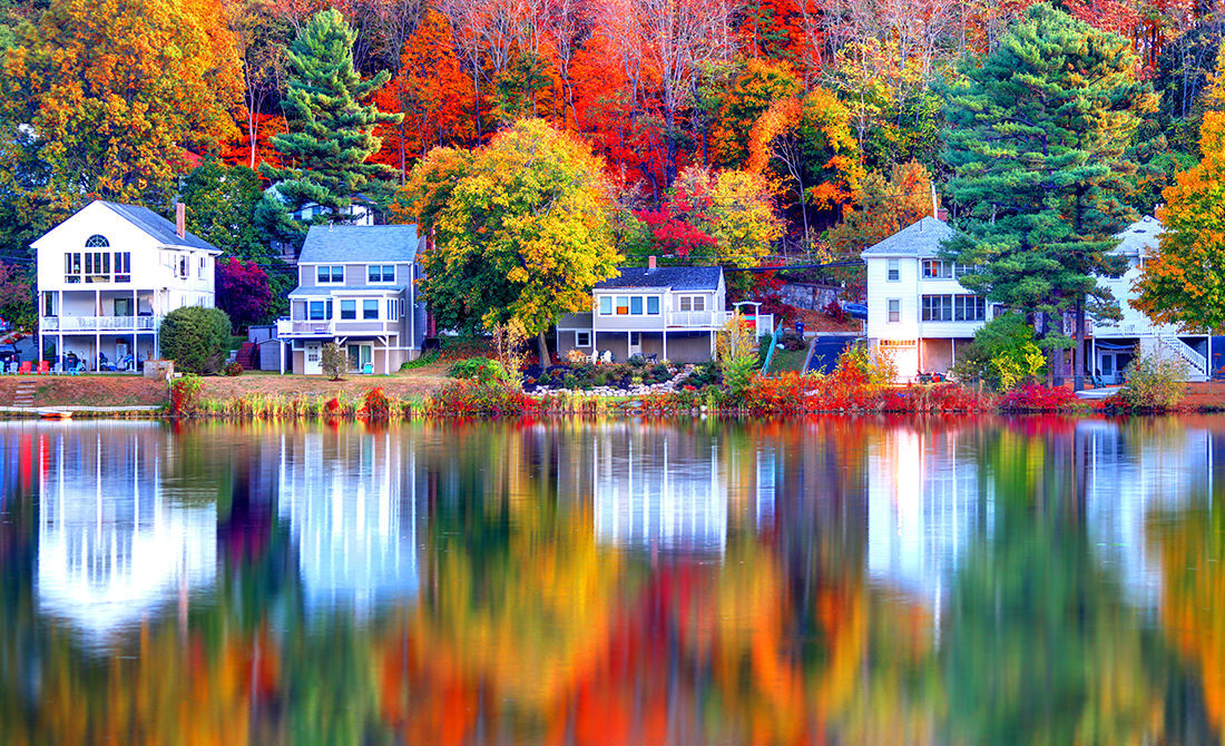 Autumn colors from hardwood trees rising along a hillside reflect on the calm waters of Chandler’s Pond in the Brighton area of Boston, Massachusetts