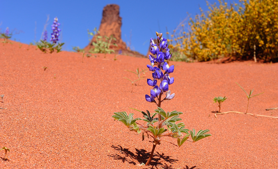 Close-up view of a colorful dwarf lupine growing in the arid landscape of Canyonlands National Park, Utah, with a butte rising in the distance