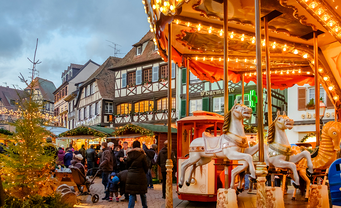 A merry-go-round glows among Christmas market stalls on a cold evening in the old town of Obernai in northeastern France