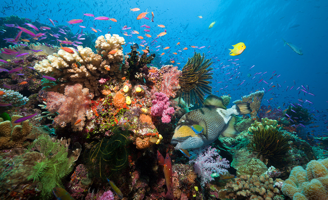 Underwater view of a variety of colorful fish, including a titan triggerfish, swimming along a living coral reef in Namena Marine Reserve, Fiji, South Pacific Ocean
