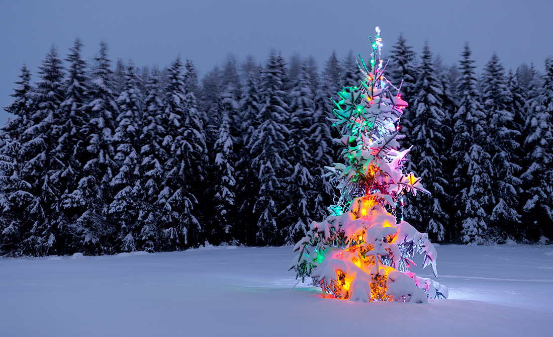 A small evergreen tree stands covered in snow and wrapped in glowing Christmas lights at dusk in a coniferous forest. Strong winds were moving the surrounding trees, creating visible motion blur in the background.