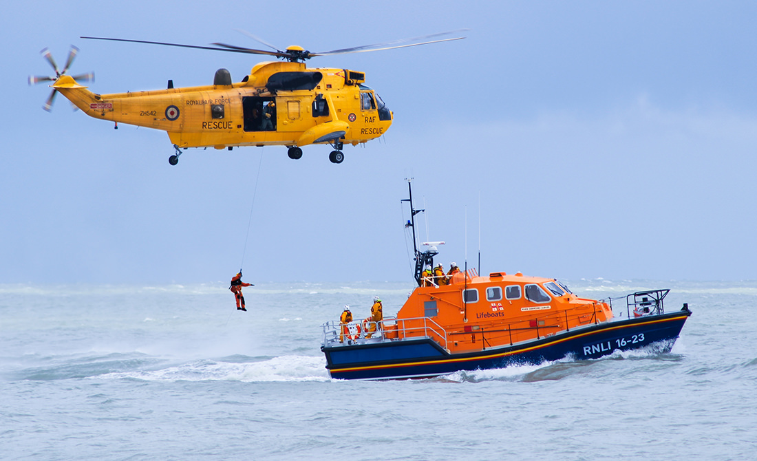 Crews from a Royal Air Force rescue helicopter and a Royal National Lifeboat Institution lifeboat demonstrate their skills over the waters of the English Channel during an Eastbourne Airbourne international airshow in Eastbourne, East Sussex, England.
