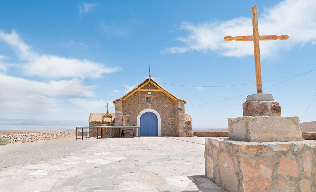A small village church stands in the dry, barren landscape of Cupo, a remote settlement located at over 11,000 feet in the Atacama Desert of northern Chile, South America. It is the driest non-polar region on Earth—a nearly lifeless landscape where many locations receive no measurable rainfall for years, or even decades.