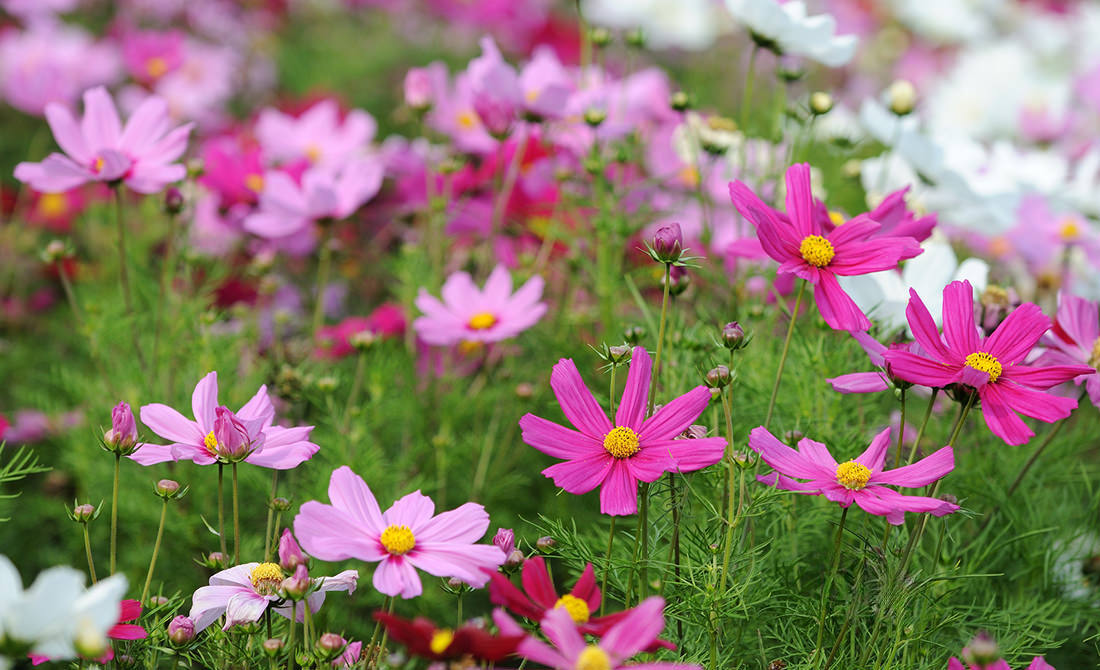 Pink and white cosmos flowers bloom across a summer field. Known for thriving in poor soil, cosmos flowers often flourish in open spaces where other flowers struggle.
