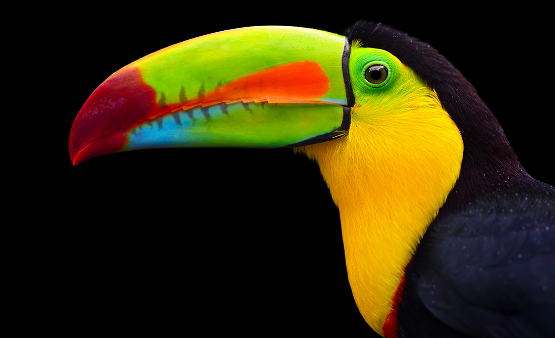 Close-up view of a vividly colorful keel-billed toucan, also known as the sulfur-breasted or rainbow-billed toucan. The photo was taken in a tropical rainforest in the Republic of Costa Rica, Central America. The dark background is created by photographing the bird in deep rainforest shade and exposing for the subject, causing the surrounding foliage to fall into shadow.