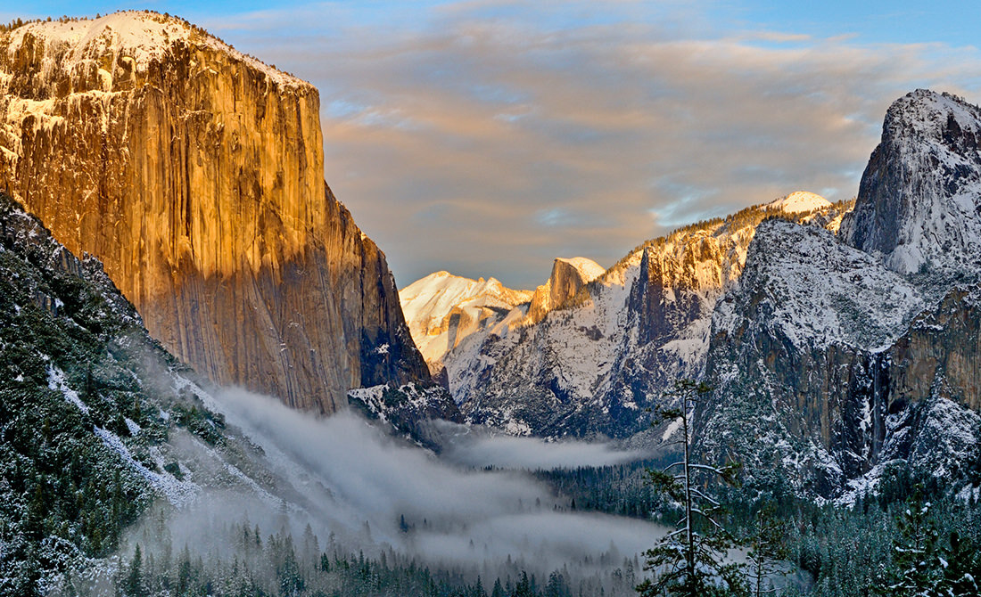 Winter fog settles into Yosemite Valley as late afternoon sunlight warms the southwest face of El Capitan. The photo was taken from the Tunnel View area of Yosemite National Park, California.