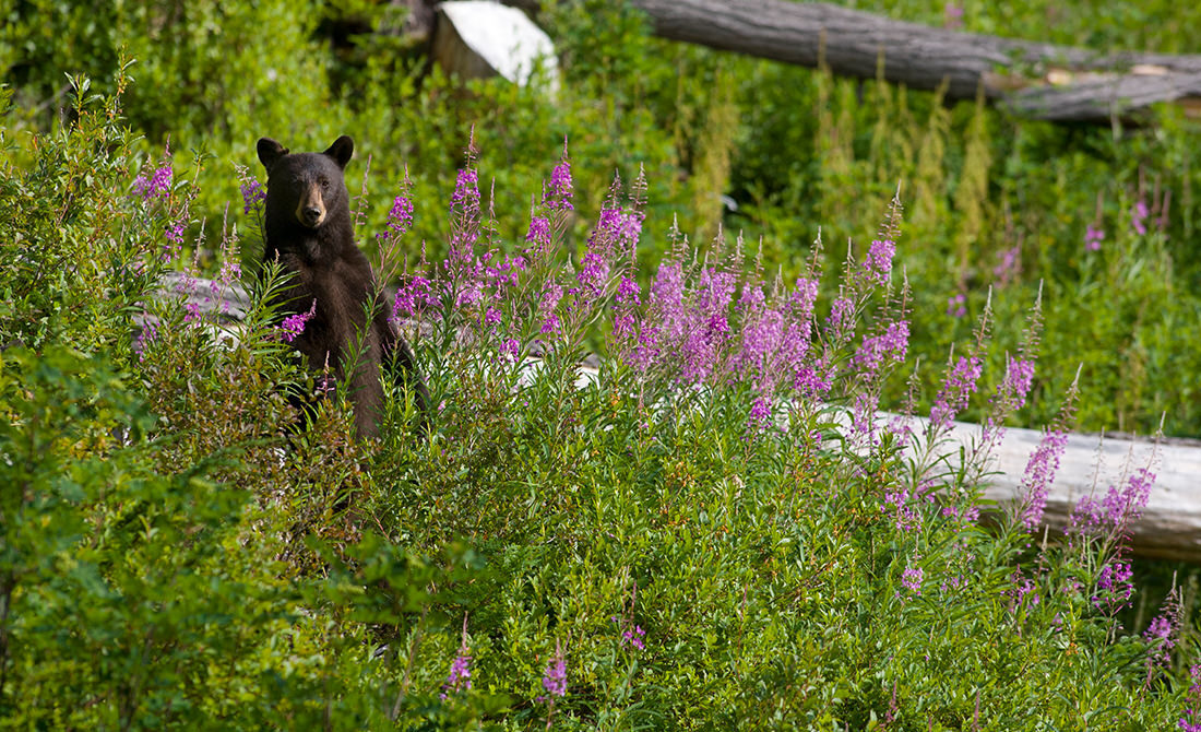 An alert black bear stands upright among summer wildflowers, watching the photographer along a bike trail at Whistler Mountain Bike Park in the Rocky Mountains of British Columbia, Canada. The park is located near the Whistler Blackcomb ski resort, the largest ski resort in North America.