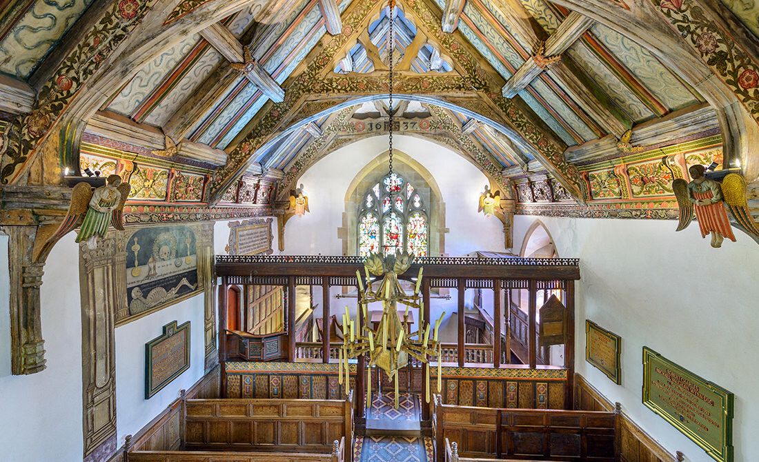 View of the ornate interior of Rug Chapel near Corwen in Denbighshire, Wales. Built in the late 1400s as a private family chapel attached to an estate, it was cared for over the generations and later absorbed into the Anglican tradition after the Reformation. The chapel features painted timber ceilings, carved angels, stained glass windows, and a candle chandelier with wooden drip catchers.