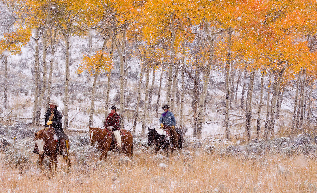 Three riders on horseback passing through a stand of golden aspens during an early autumn snowfall in Wyoming