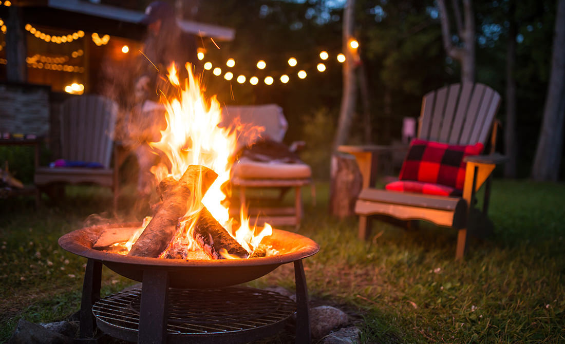 Late evening campfire outside a chalet in Quebec, Canada, with Adirondack chairs and string lights creating a warm, welcoming outdoor gathering space
