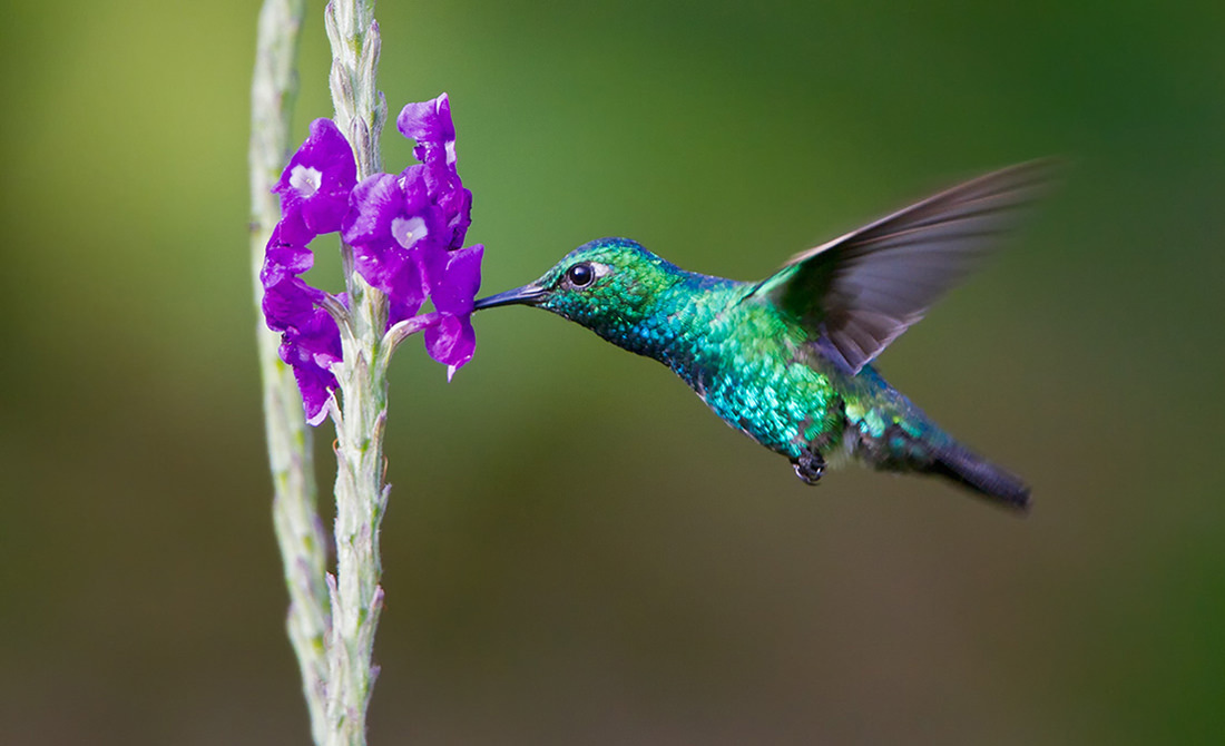 Blue-tailed Emerald hummingbird hovering while feeding at a vibrant flower in the Republic of Peru, South America