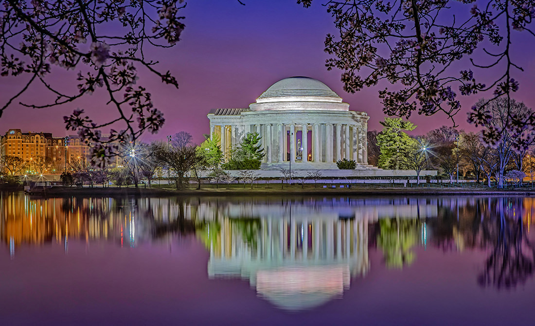 Pre-sunrise twilight at the Thomas Jefferson Memorial reflected in the Tidal Basin in Washington, DC. Dedicated in 1943, the neoclassical structure honors the principal author of the Declaration of Independence and the 3rd president of the United States of America.