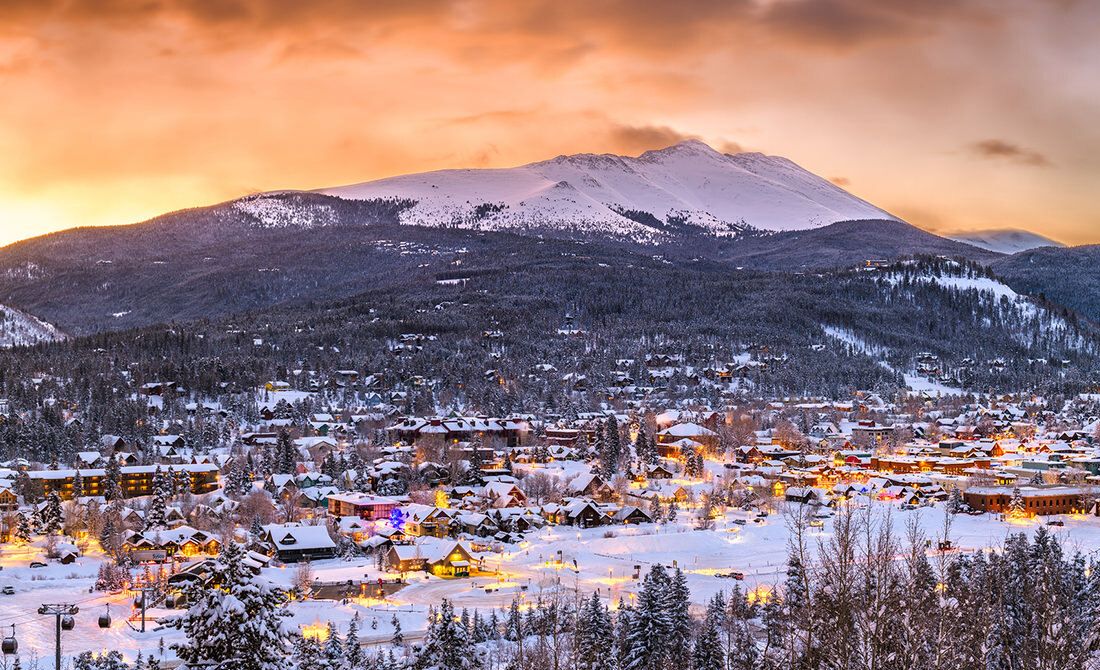 First light of the day over Breckenridge, Colorado, on a winter day. The photo was taken looking east/southeast from the Breckenridge Overlook on Ski Hill Road, with ski lifts visible in the lower left.