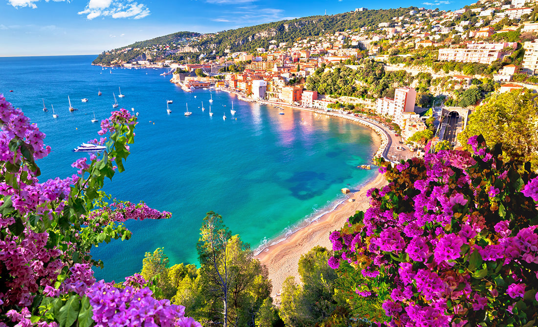 Bright summer morning view of Villefranche-sur-Mer, a bayfront town along the French Riviera in southeastern France