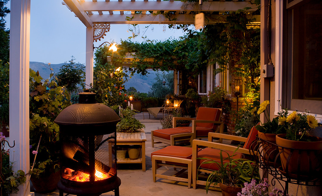 Twilight settling over a colorful garden terrace with wooden pergolas, glowing firelight, and a view toward distant mountain ridges