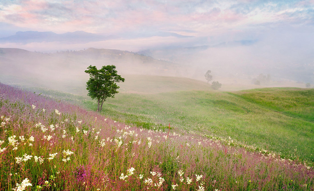 Morning mist drifts across a wildflower-covered hillside in the Carpathian Mountains. Today’s photo is part 2 of 2 featuring Psalm 29:2.