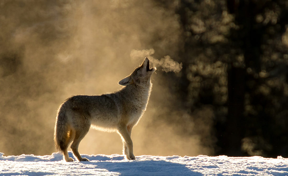 Backlit by low winter sunlight, a wild coyote howls in the cold mist of Yellowstone National Park, Wyoming
