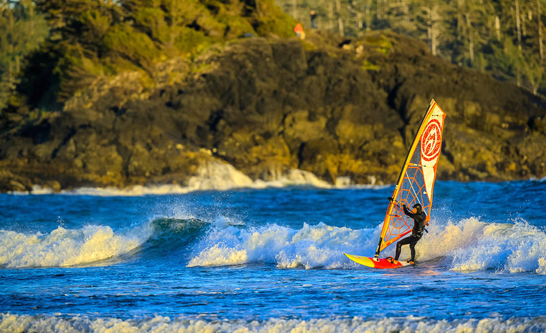 A windsurfer wearing a full wetsuit rides breaking waves along the western coastline of Vancouver Island in Pacific Rim National Park Reserve, British Columbia, Canada. The waters of the open Pacific here remain cold throughout the year. Note the two people watching in the distance.