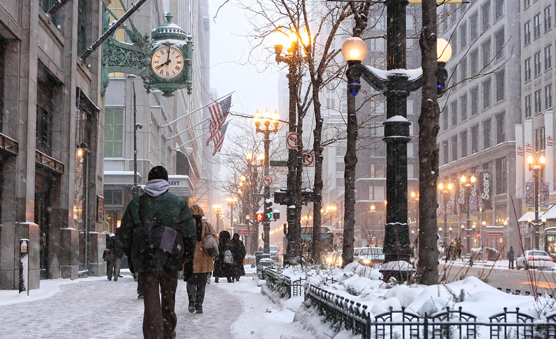 People walking along State Street on a snowy morning in downtown Chicago, Illinois, passing beneath a lighted bronze street clock and decorative lamp posts lining the avenue. For more than a century, State Street has been one of the principal retail and entertainment corridors of the Midwest.