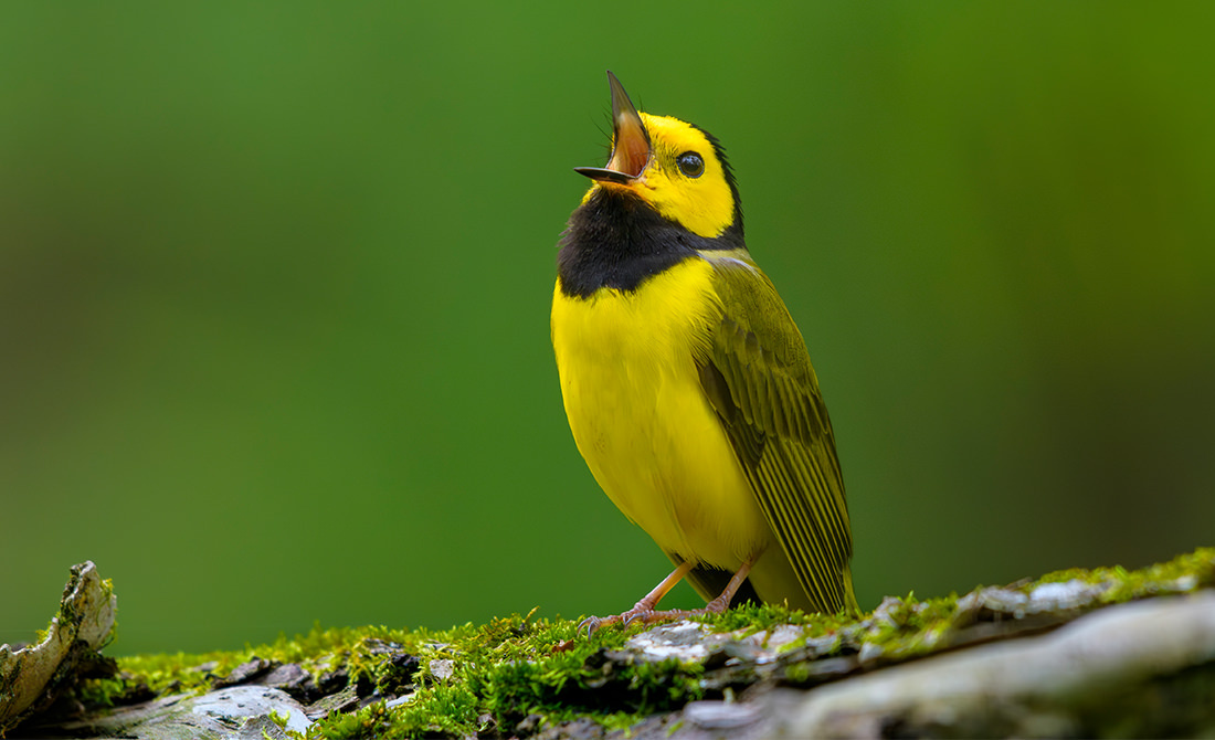 An adult male Hooded Warbler singing from a moss-covered log in a forest, showing its bright yellow body and solid black hood and throat