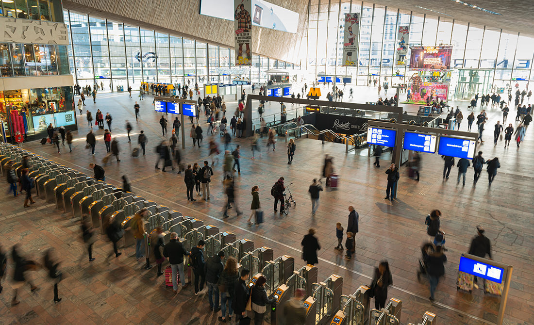 High-angle view of people moving through turnstiles inside Rotterdam Centraal Train Station in Rotterdam, the second-largest city in the Kingdom of the Netherlands