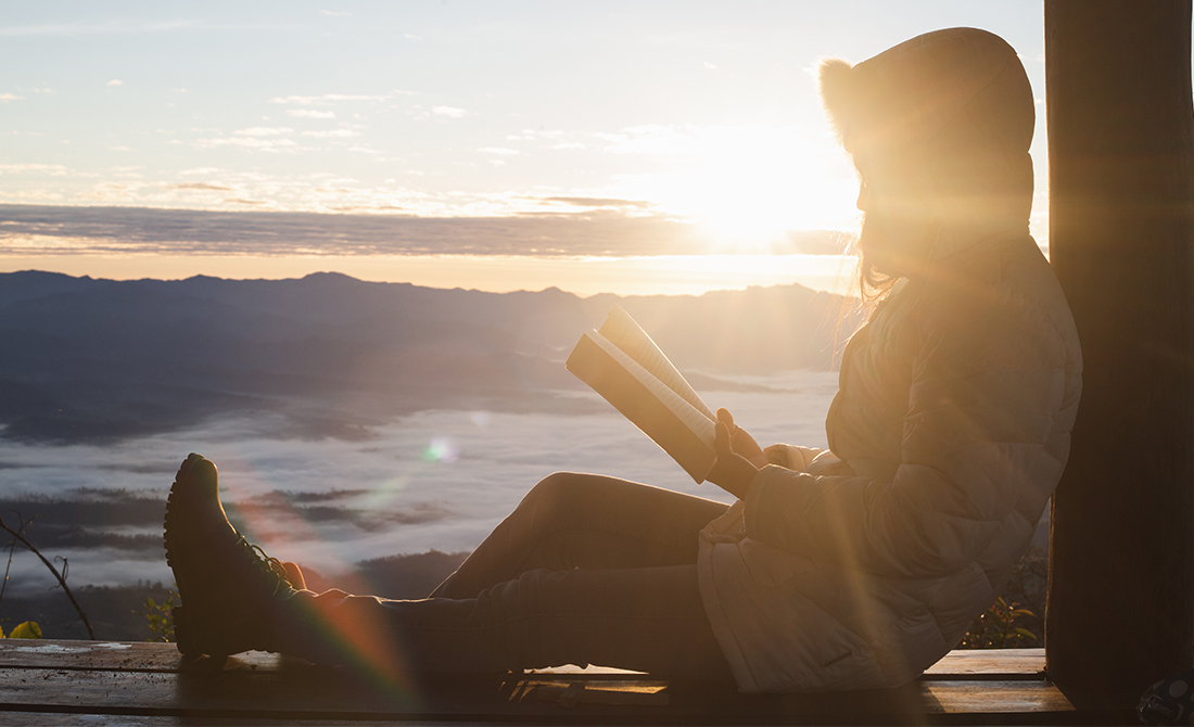 A young woman reads from a Bible on a cool morning at sunrise. She is wearing a hooded jacket and is seated on a wooden bench with a view of distant mountains and heavy fog in the valley below.
