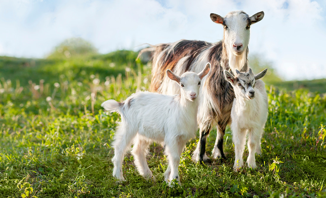 Mother goat standing with her two young kids in a sunlit pasture. Goats are highly social animals, often staying close together and communicating through gentle vocalizations and body language.