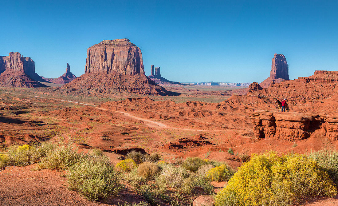 A lone rider stands with his horse overlooking Monument Valley, located along the Arizona–Utah border, with towering sandstone buttes rising across the high desert of the Navajo Nation