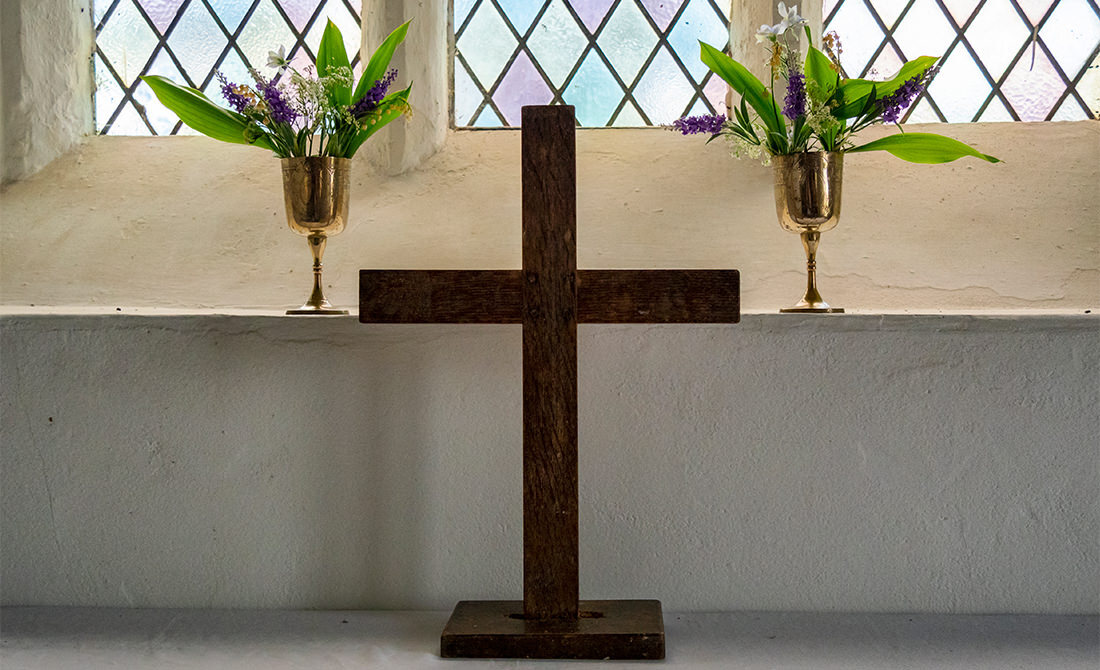 A small wooden cross stands on a simple church altar beneath leaded glass windows, with two brass chalices holding spring flowers on the sill above. The photo was taken in a church in Suffolk, England.