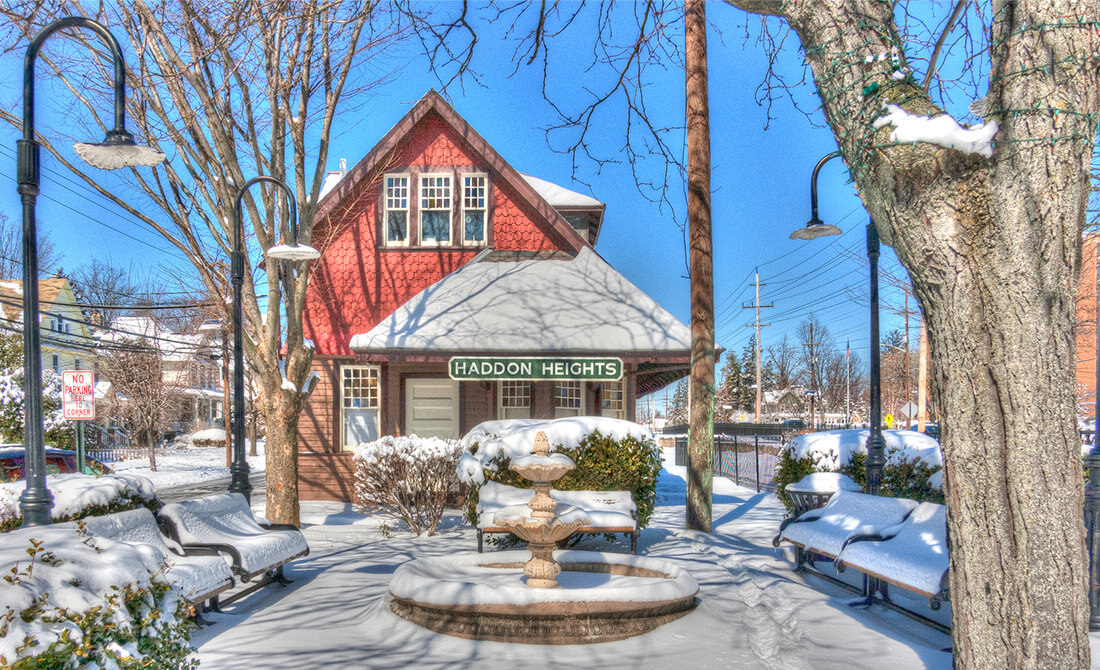 Fresh snowfall covers a fountain, benches, and the railroad station house (c. 1900) in Haddon Heights, New Jersey. Located about 10 miles southeast of Philadelphia, Pennsylvania, the rail line runs along the right side of the station.