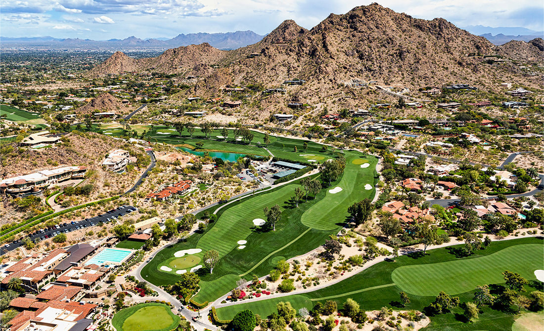 Aerial view of a golf course in the Mummy Mountain area of Paradise Valley, Arizona, with green fairways winding through the desert foothills and homes built up along the slopes