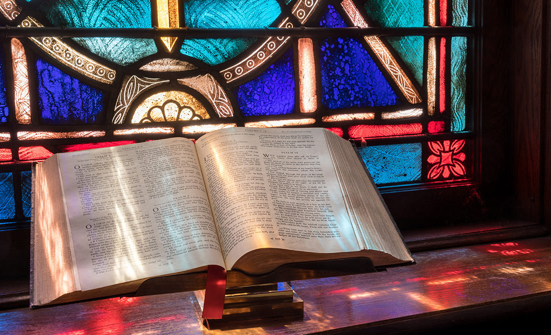 Sunlight streaming in through a colorful stained glass church window and illuminating a large Bible