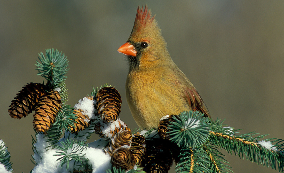 A female Northern Cardinal perched among snow-dusted pine cones on an evergreen branch in the eastern United States