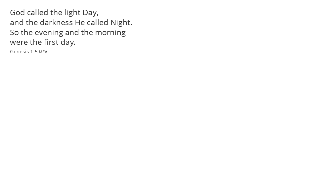 God called the light Day, and the darkness He called Night. So the evening and the morning were the first day.