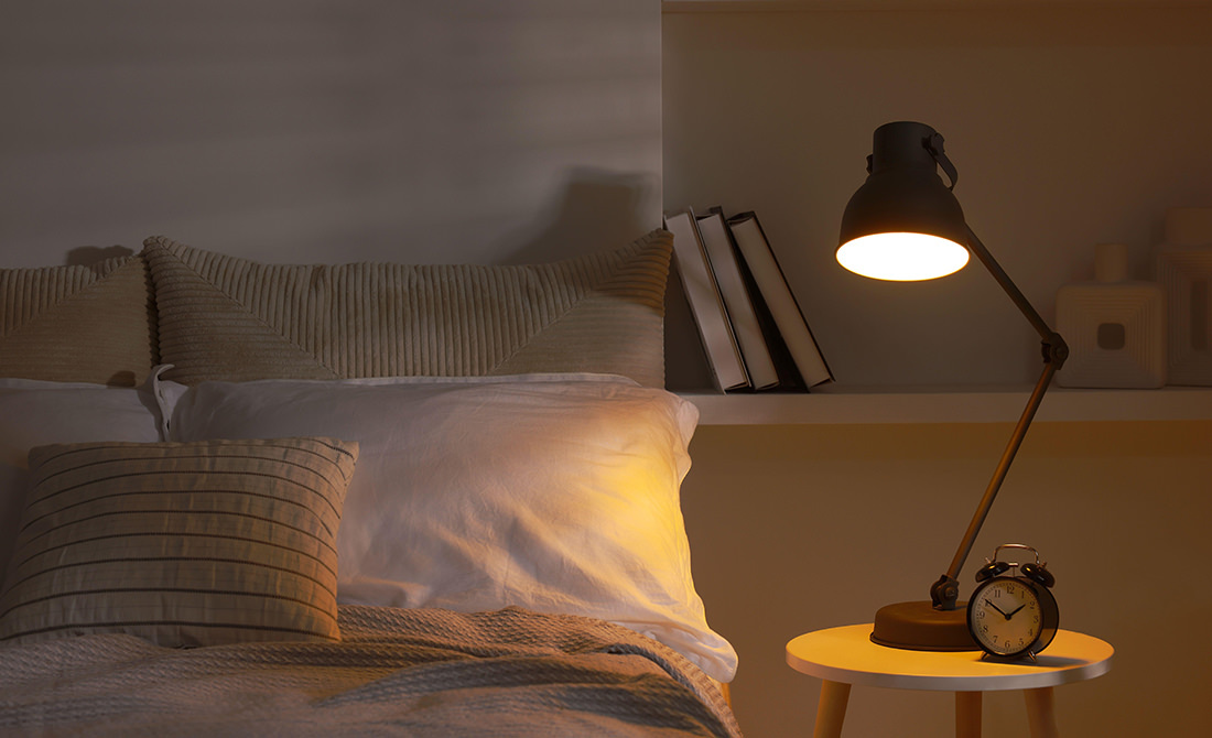 Warm bedside scene featuring comfortable pillows and linens, a glowing lamp and clock on a nightstand, and a small bookshelf