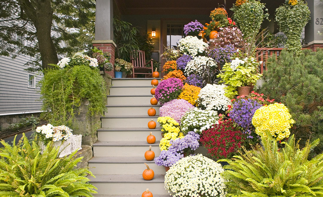 A front porch overflowing with colorful mums, ferns, and neatly lined pumpkins on a quiet residential street near Portland, Maine