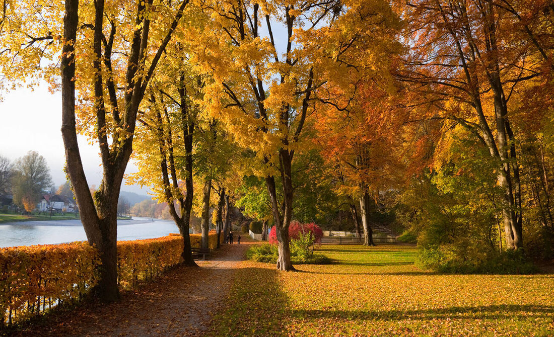 Autumn sunlight filters through a tree-lined promenade along the River Isar in Bad Tölz, Bavaria, Germany, as an adult walks with two children in the distance