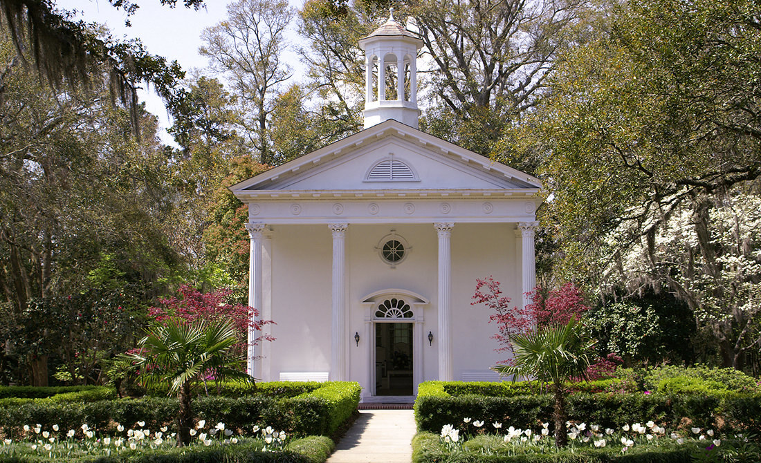 A southern-style chapel with classical white columns and a graceful cupola, set within a private garden of live oaks, dogwoods, red maples, palms, and flowers. The photo was taken in coastal North Carolina.